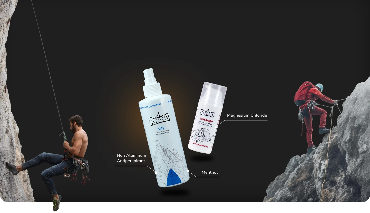 Rhino Skin Solutions is designed for climbers, protecting your grip, healing worn skin, and speeding up recovery from one send to the next. Natural, effective, and made for those who live to push their limits.