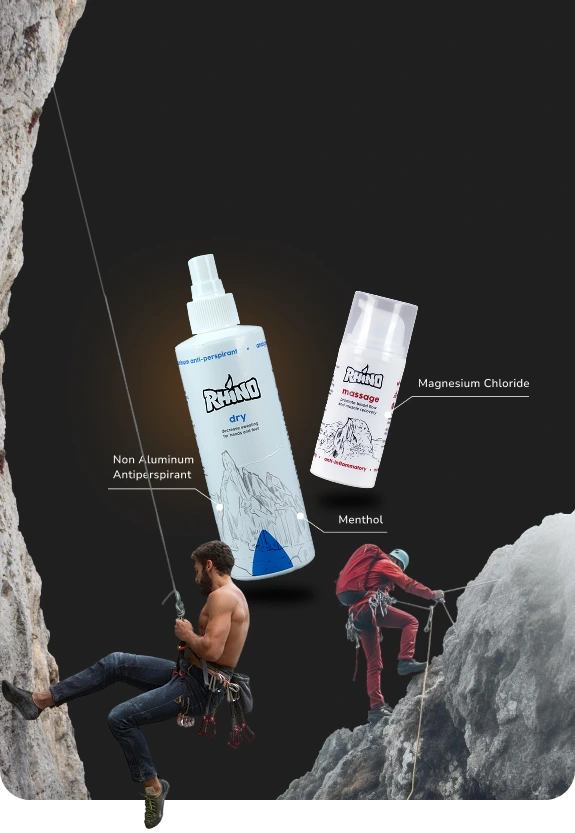 Rhino Dry keeps your hands dry and your grip solid on any surface, rock, plastic, or chalked-up holds.